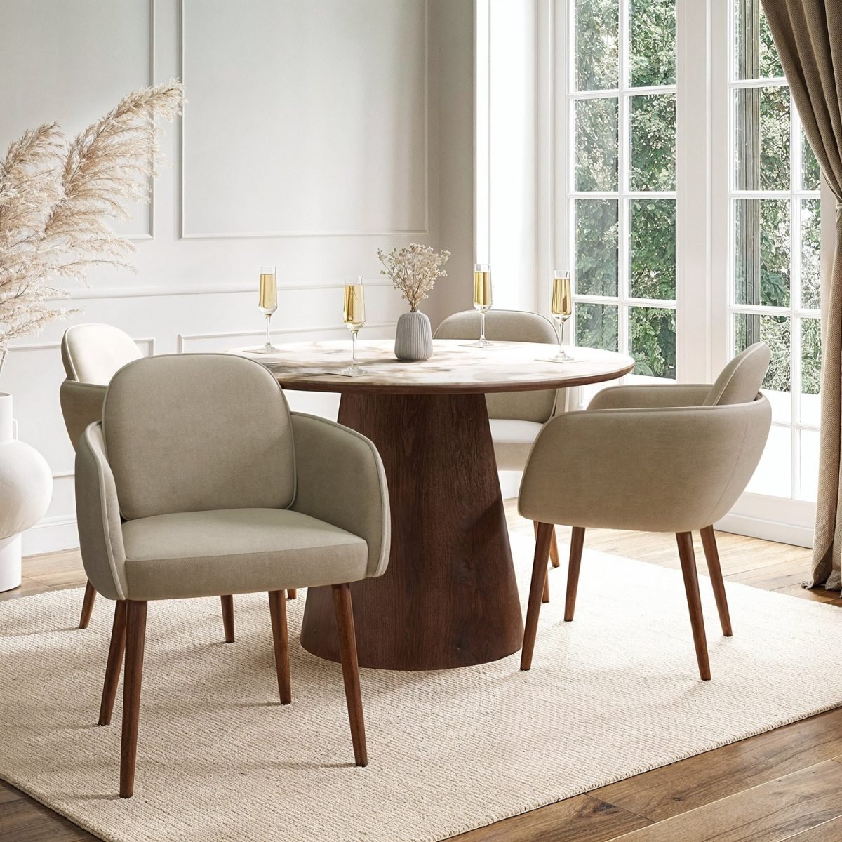 - 1 x Neutral Ceramic Round Dining Table with Walnut Pedestal Base